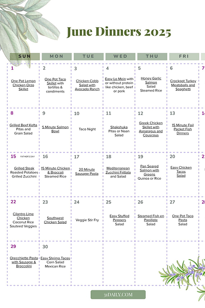 To make the most of the season, I’ve pulled together a June Dinner Calendar—a full month of easy, seasonal dinners you can mix, match, and repeat. Whether you're firing up the grill for Father’s Day, tossing together light salads, or craving simple one-skillet meals, there’s something here for every night of the week.