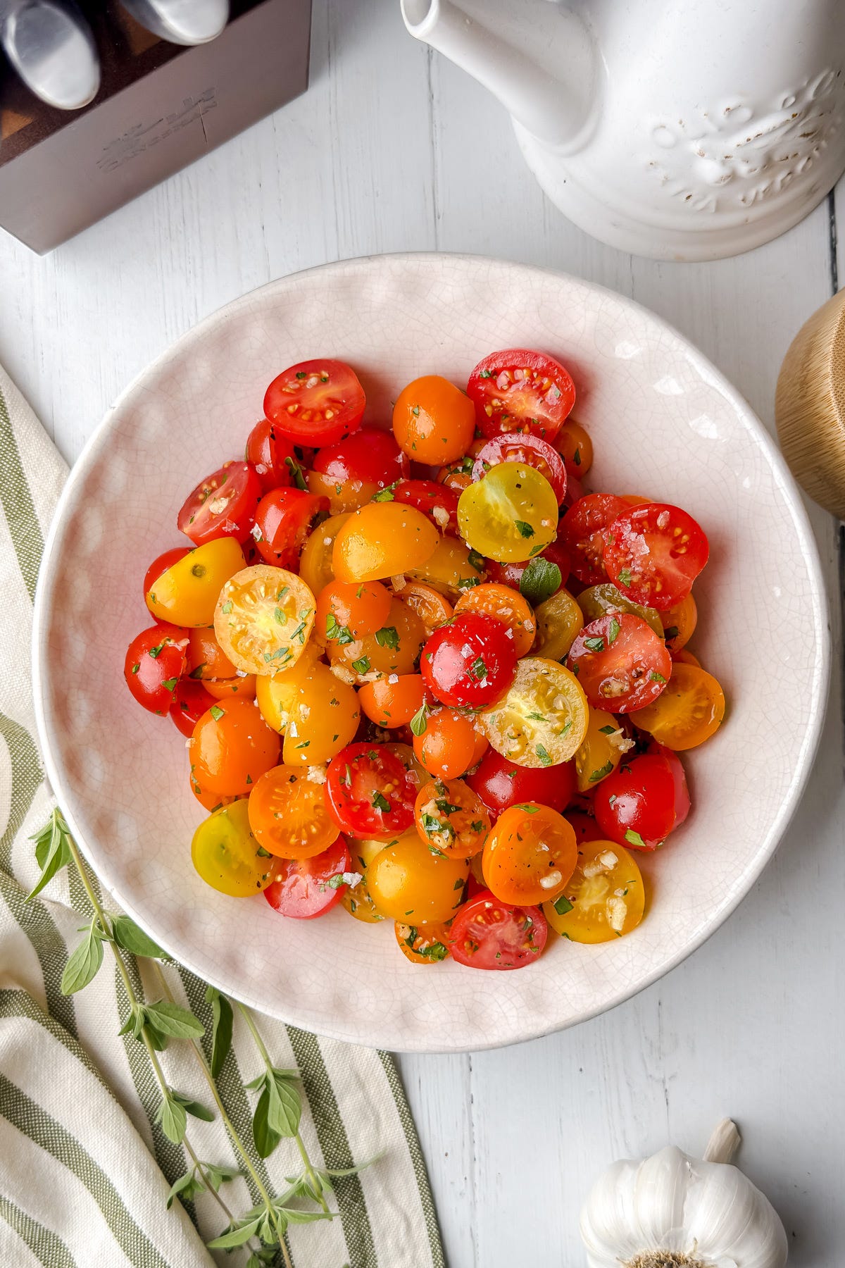 Let them sit for 2-3 hours at minimum, covered in the fridge, and they’ll reward you by growing more flavorful by the hour. Make in small batches with fresh tomatoes (like sliced beefsteak) or halved cherry tomatoes, as I’m doing today.
