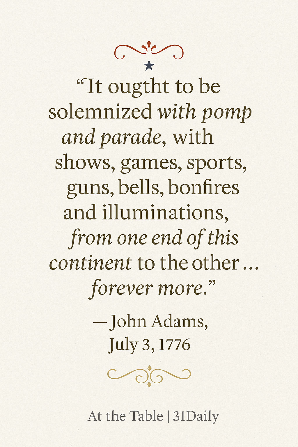 “It ought to be solemnized with pomp and parade, with shows, games, sports, guns, bells, bonfires and illuminations, from one end of this continent to the other … forever more.”