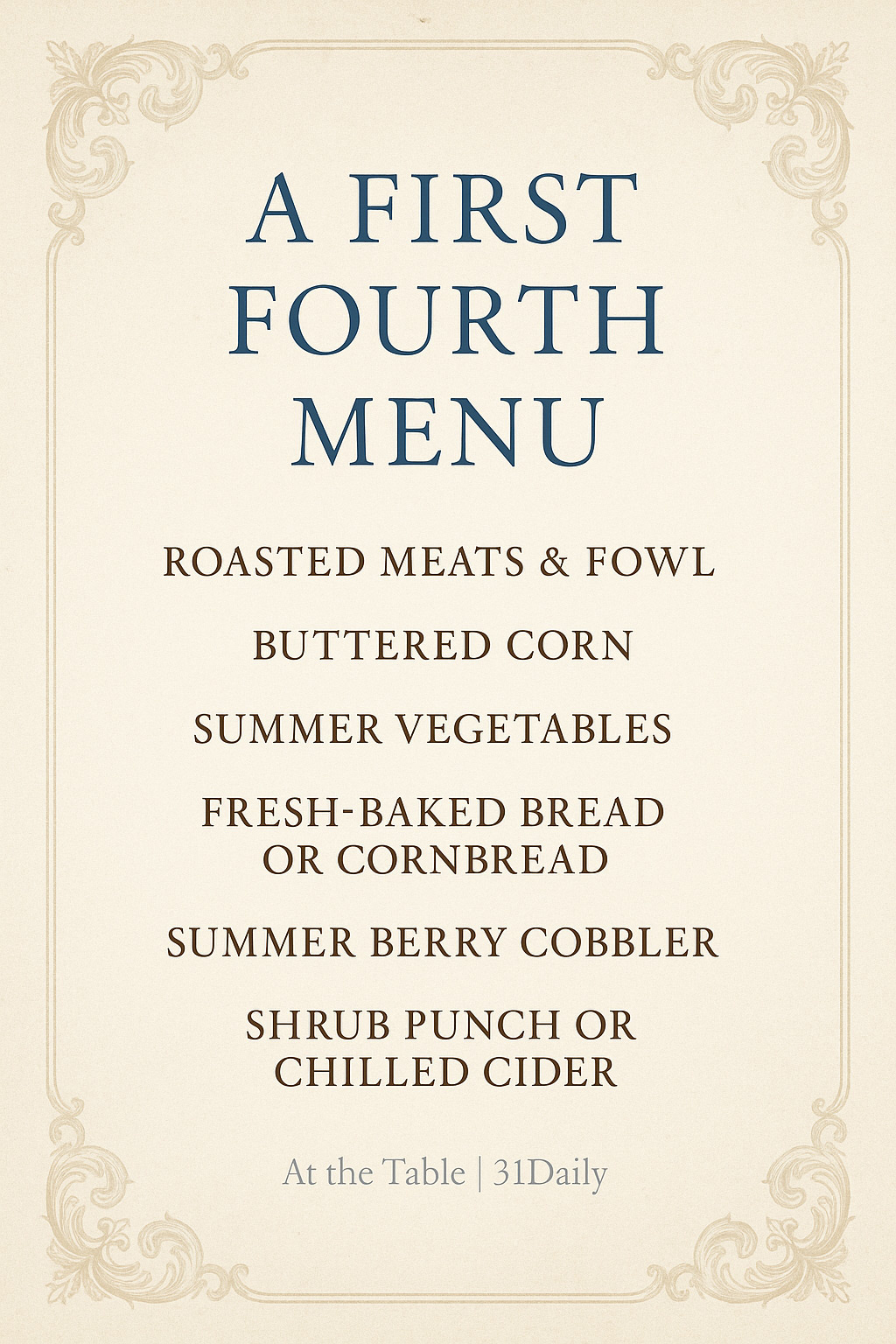 Download a printable First Fourth Menu, styled in early American tradition and ready to inspire your celebration.