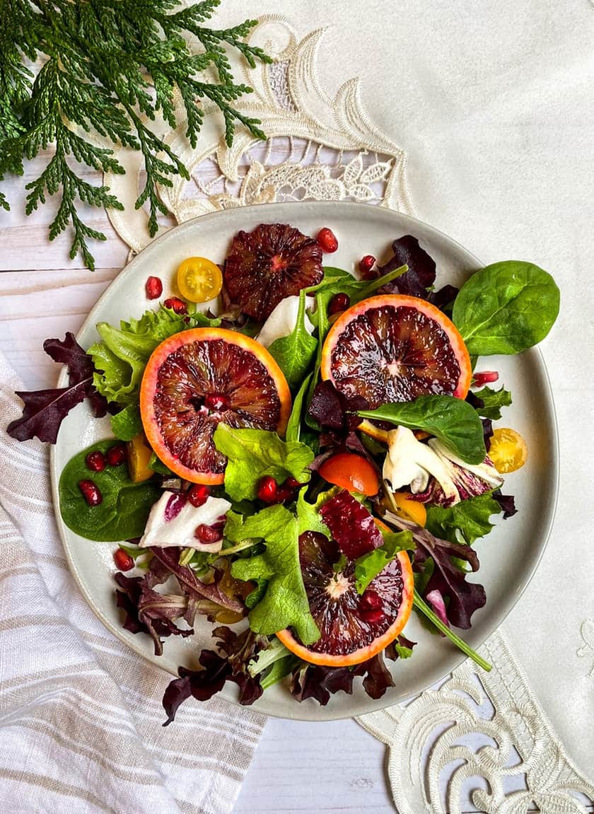 Sometimes the table needs something bright and uncluttered. A winter citrus salad brings color and light with almost no work at all: slices of orange or grapefruit, a drizzle of good olive oil, a handful of herbs, and maybe a scattering of pomegranate seeds. It glows on a holiday table and pairs with everything.